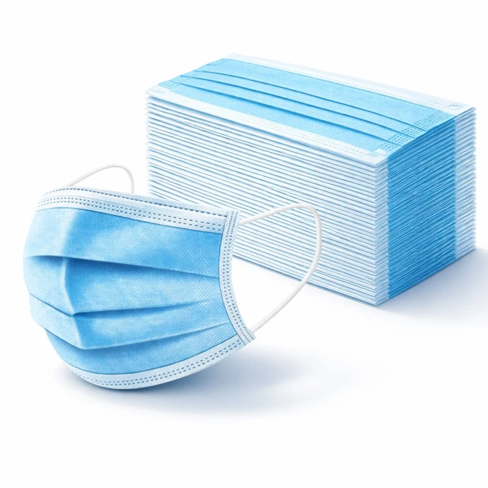 Mascarillas de protección facial con diseño de tres pliegues. Ajuste mediante dos bandas elásticas y un clip nasal.